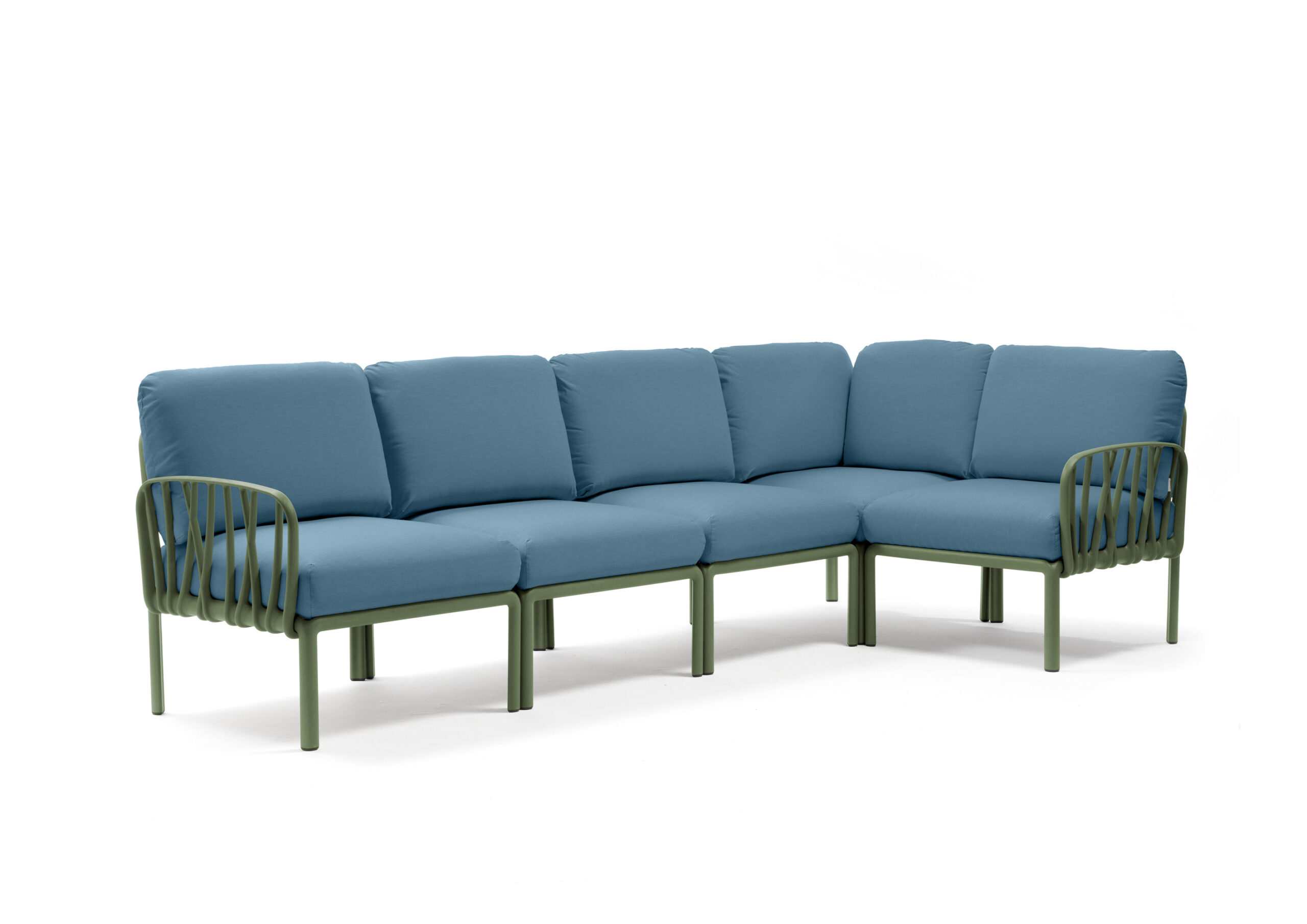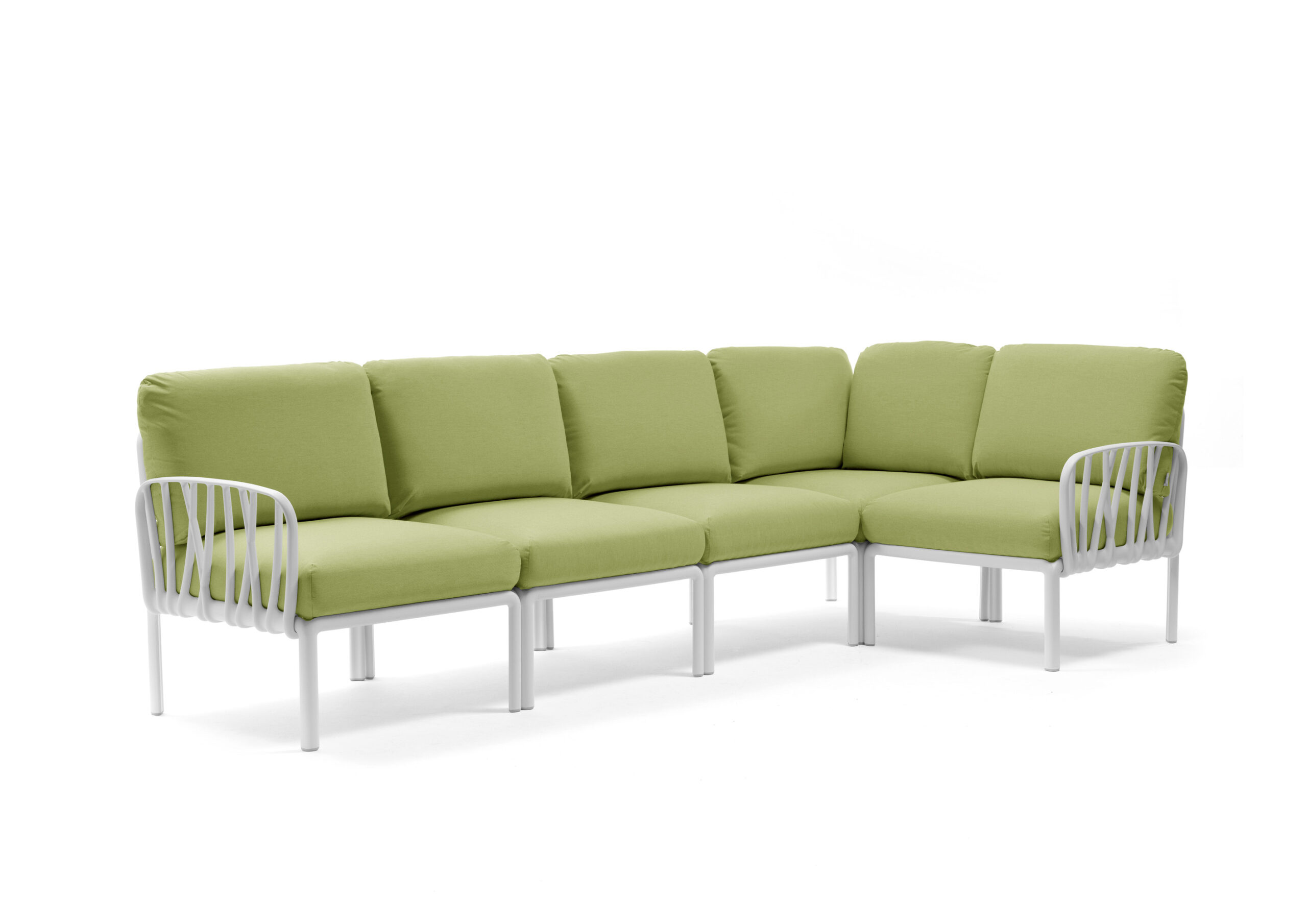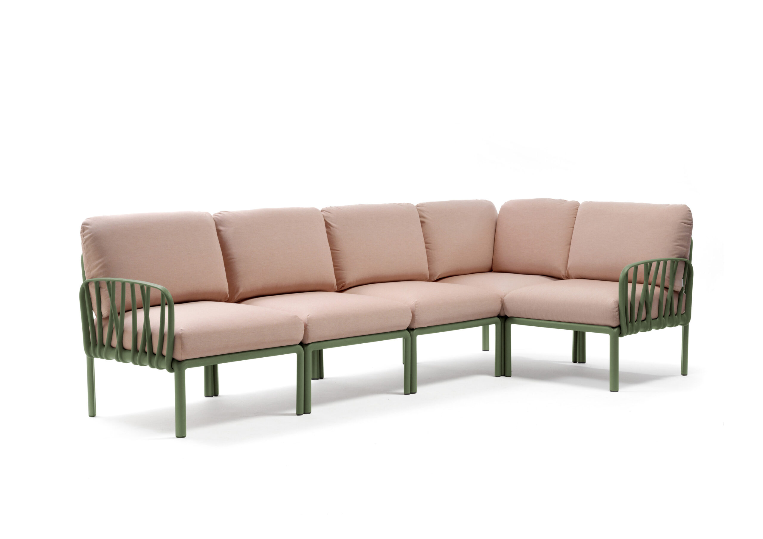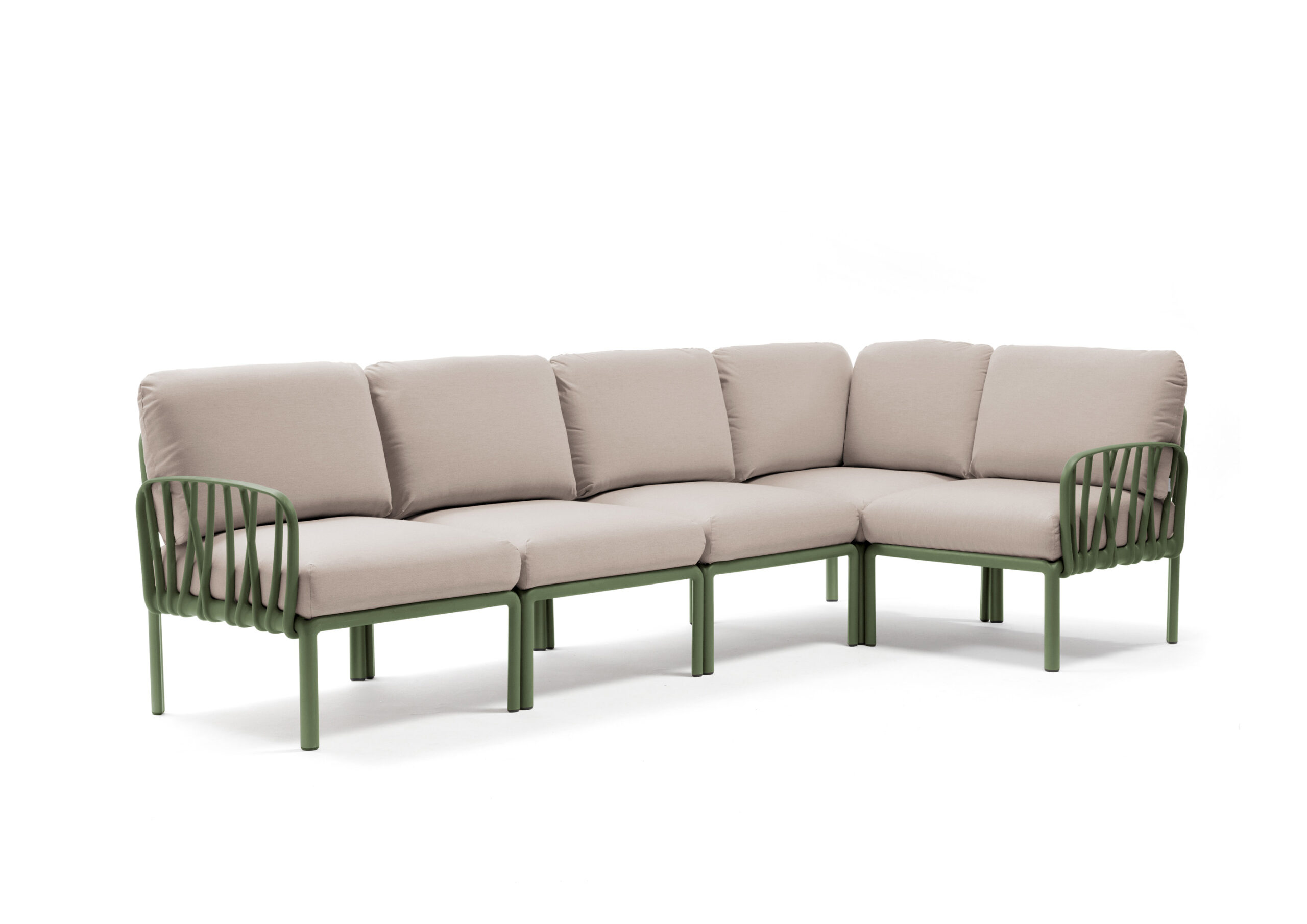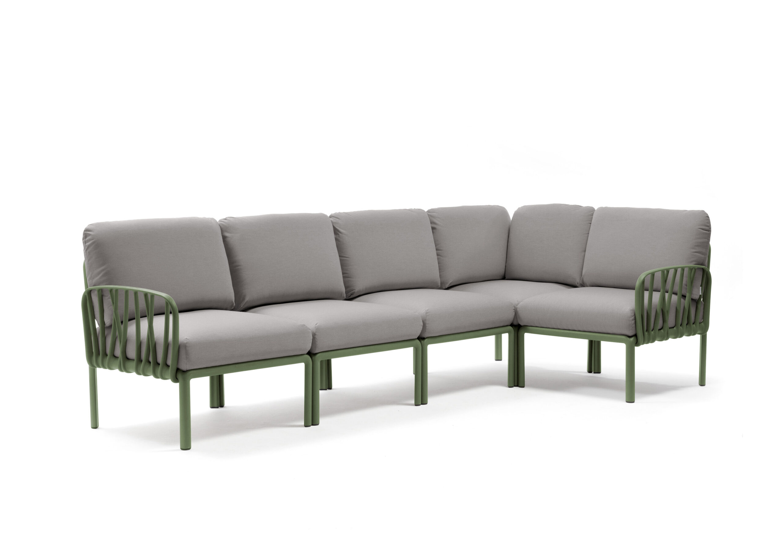 Mooduldiivan Komodo 5. Mooduldiivanit saab paigutada erinevalt vastavalt soovile. Padjakatted on eemaldatavad tõmblukuga lihtsaks hoolduseks. Seljatoed ja käetoed saab kinnitada istme igale küljele. Libisemiskindlad jalad. Raam valmistatud UV-kindlate lisanditega klaaskiuga tugevdatud polüpropüleenvaigust. Regenereeritud kanga värvus (giungla) võib taaskasutatud materjali kasutamise tõttu erineda. Toode kuulub Itaalia kvaliteetbrändi Nardi valikusse, mis on tuntud oma vastupidava ja stiilse õuemööbli poolest.