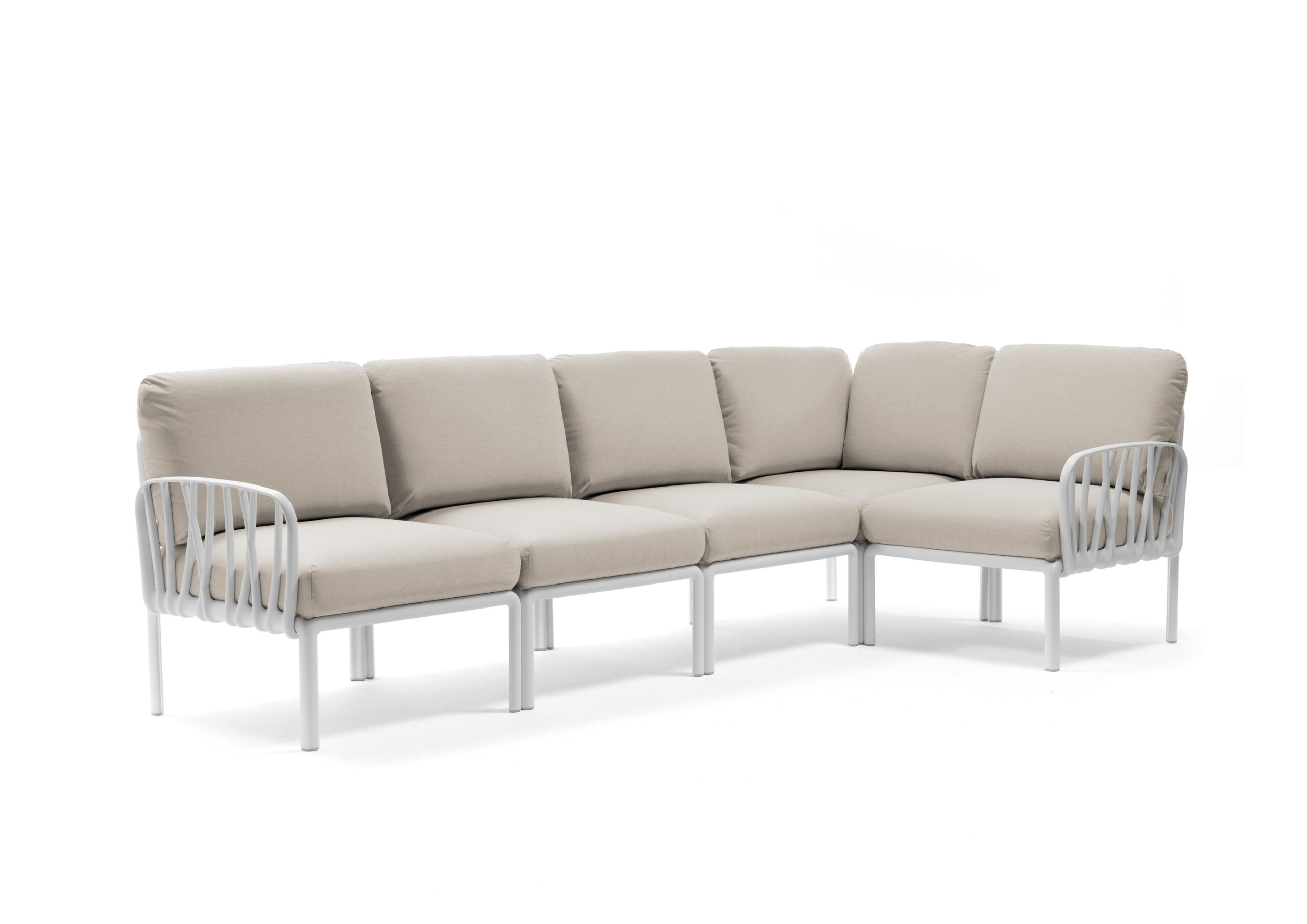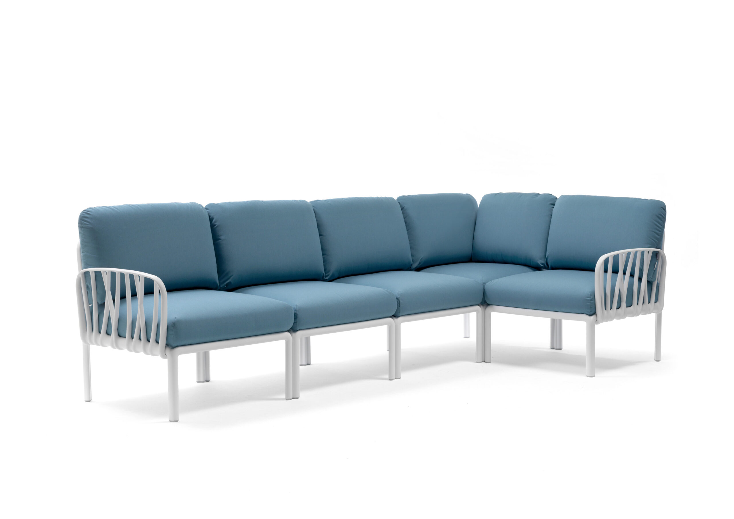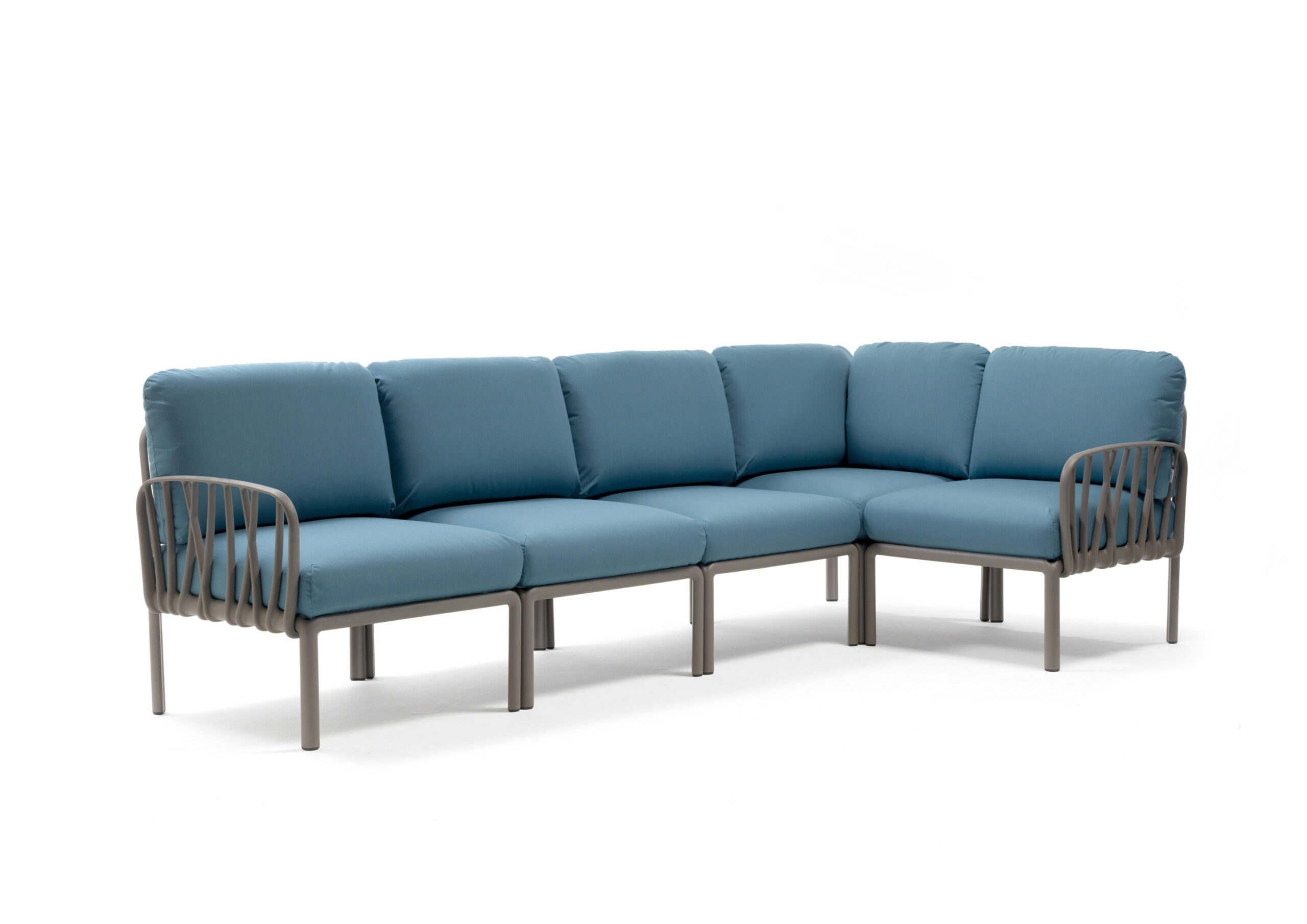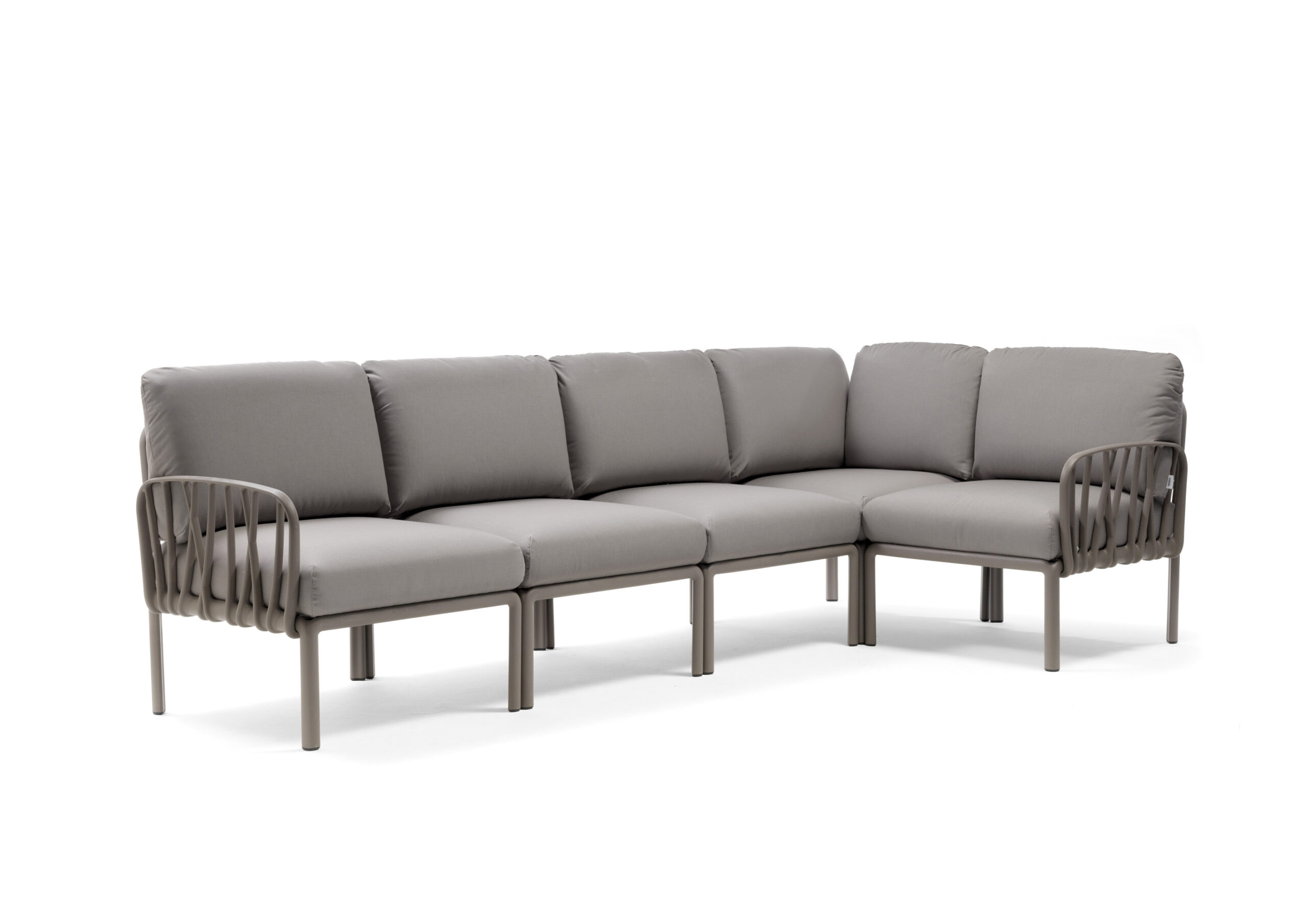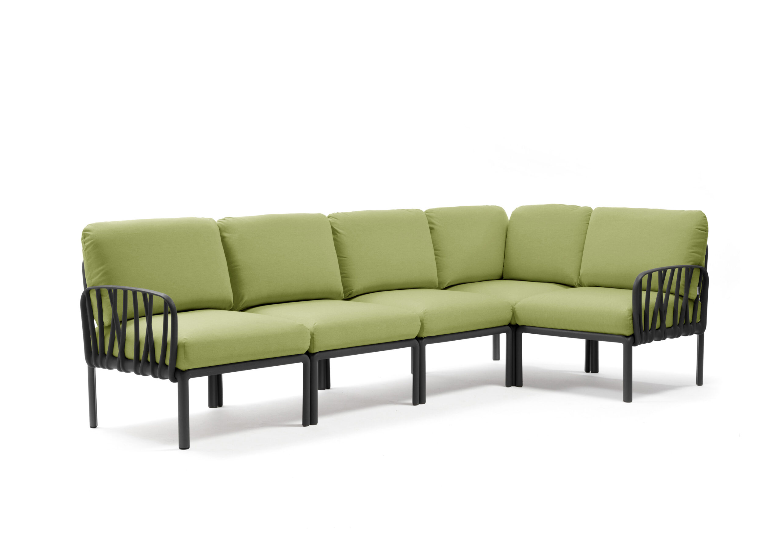 Mooduldiivan Komodo 5. Mooduldiivanit saab paigutada erinevalt vastavalt soovile. Padjakatted on eemaldatavad tõmblukuga lihtsaks hoolduseks. Seljatoed ja käetoed saab kinnitada istme igale küljele. Libisemiskindlad jalad. Raam valmistatud UV-kindlate lisanditega klaaskiuga tugevdatud polüpropüleenvaigust. Regenereeritud kanga värvus (giungla) võib taaskasutatud materjali kasutamise tõttu erineda. Toode kuulub Itaalia kvaliteetbrändi Nardi valikusse, mis on tuntud oma vastupidava ja stiilse õuemööbli poolest.