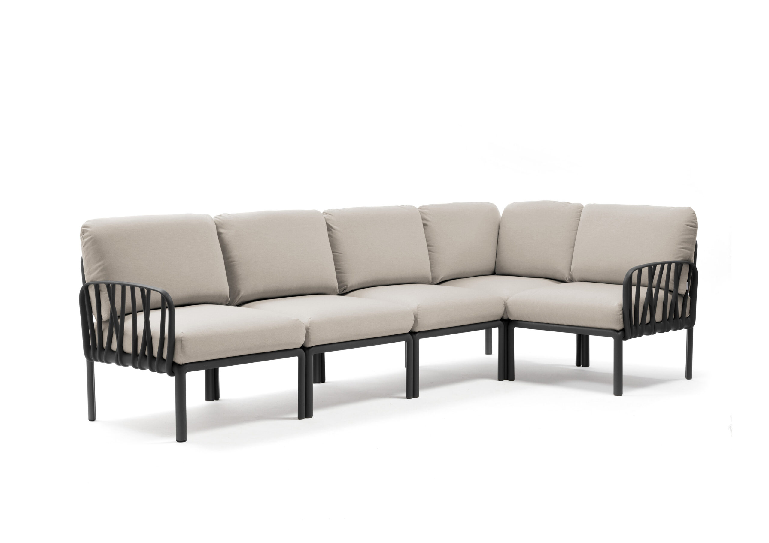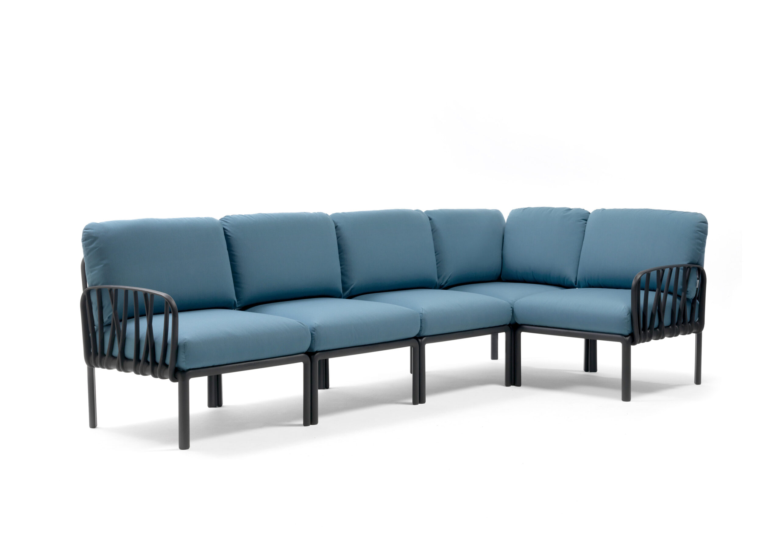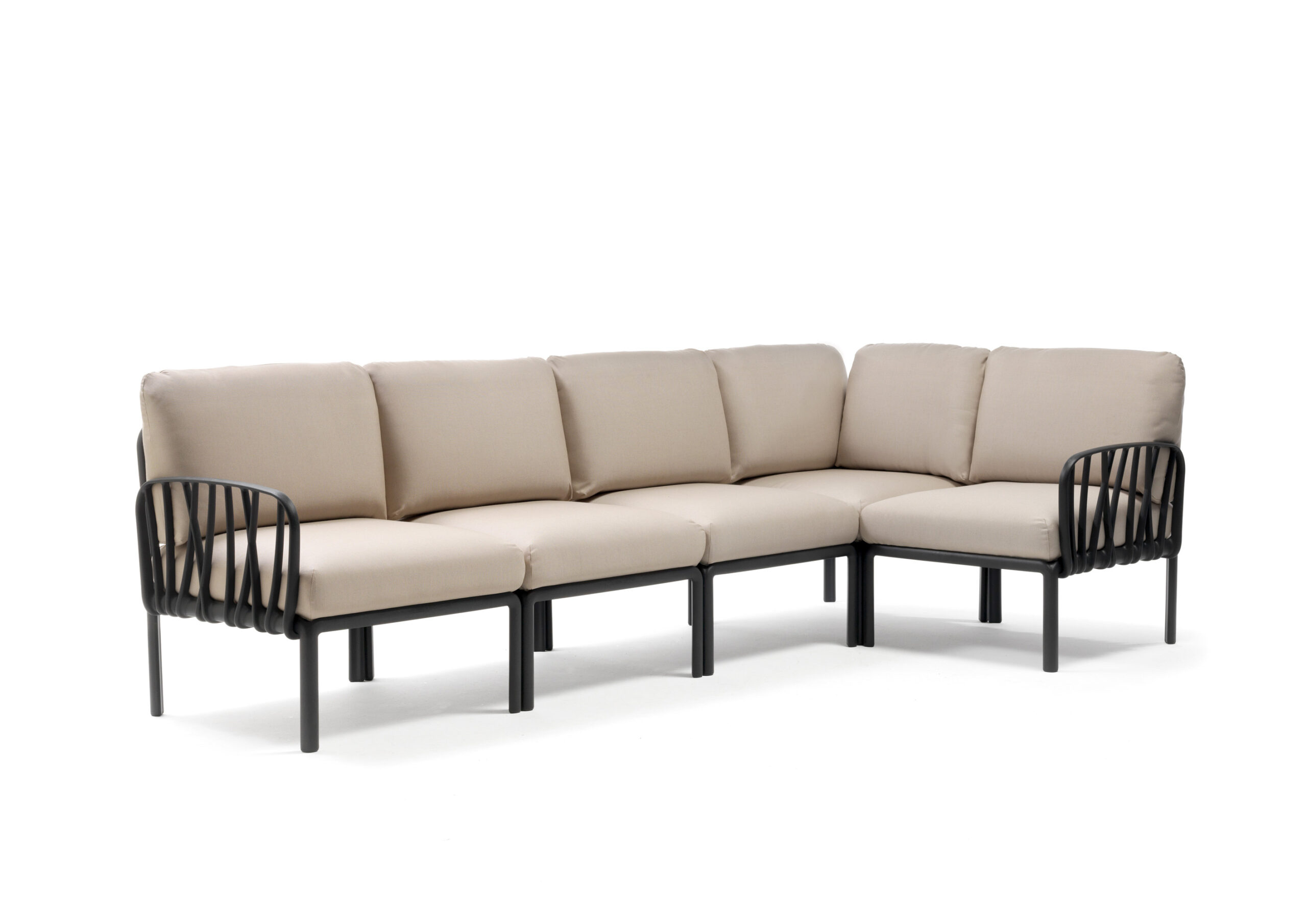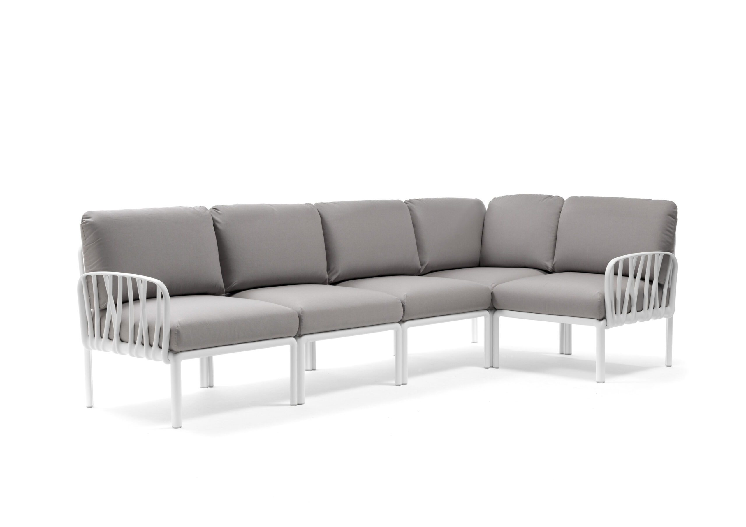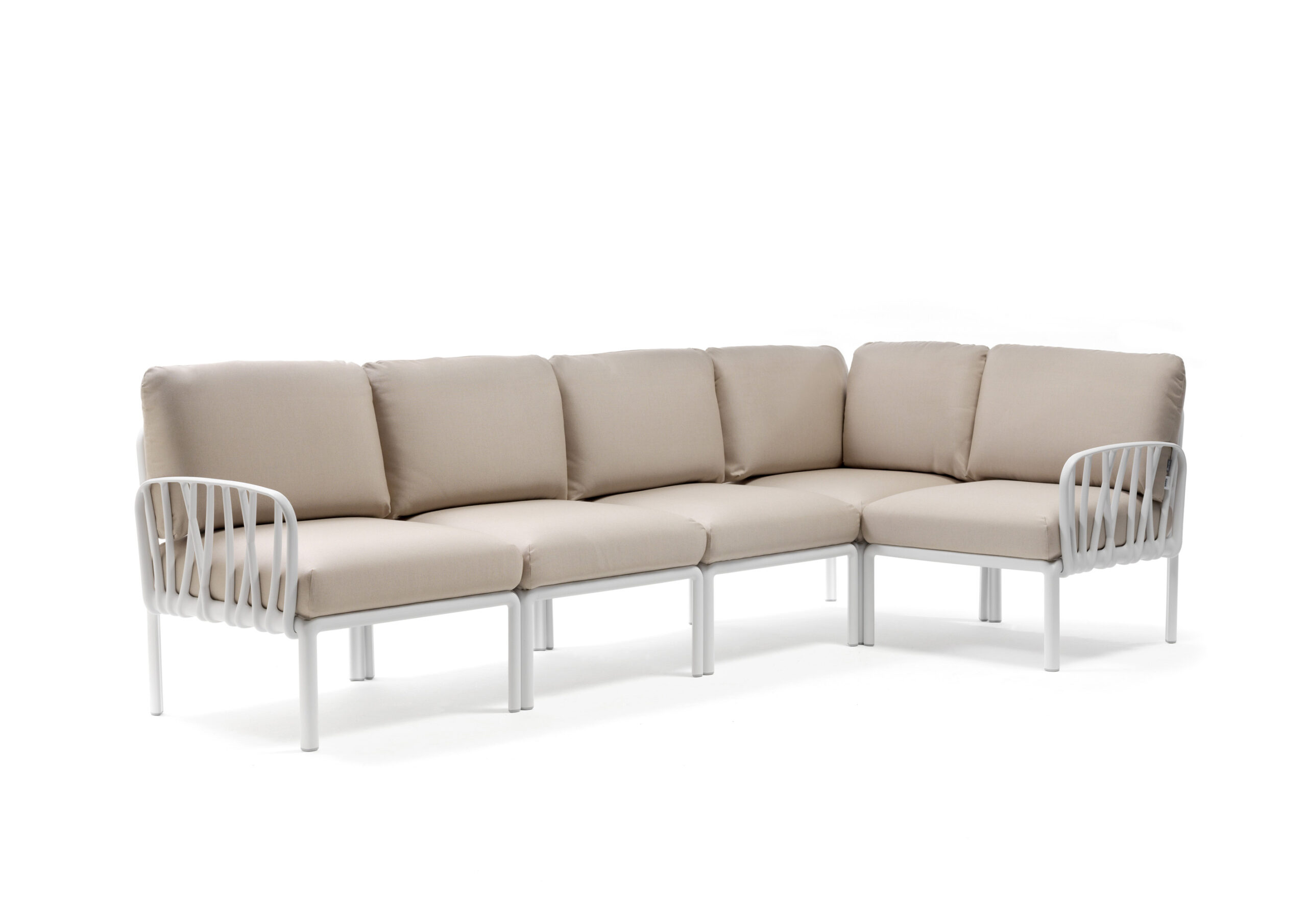 Mooduldiivan Komodo 5. Mooduldiivanit saab paigutada erinevalt vastavalt soovile. Padjakatted on eemaldatavad tõmblukuga lihtsaks hoolduseks. Seljatoed ja käetoed saab kinnitada istme igale küljele. Libisemiskindlad jalad. Raam valmistatud UV-kindlate lisanditega klaaskiuga tugevdatud polüpropüleenvaigust. Regenereeritud kanga värvus (giungla) võib taaskasutatud materjali kasutamise tõttu erineda. Toode kuulub Itaalia kvaliteetbrändi Nardi valikusse, mis on tuntud oma vastupidava ja stiilse õuemööbli poolest.
