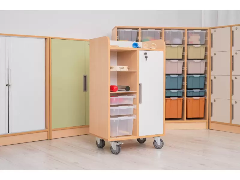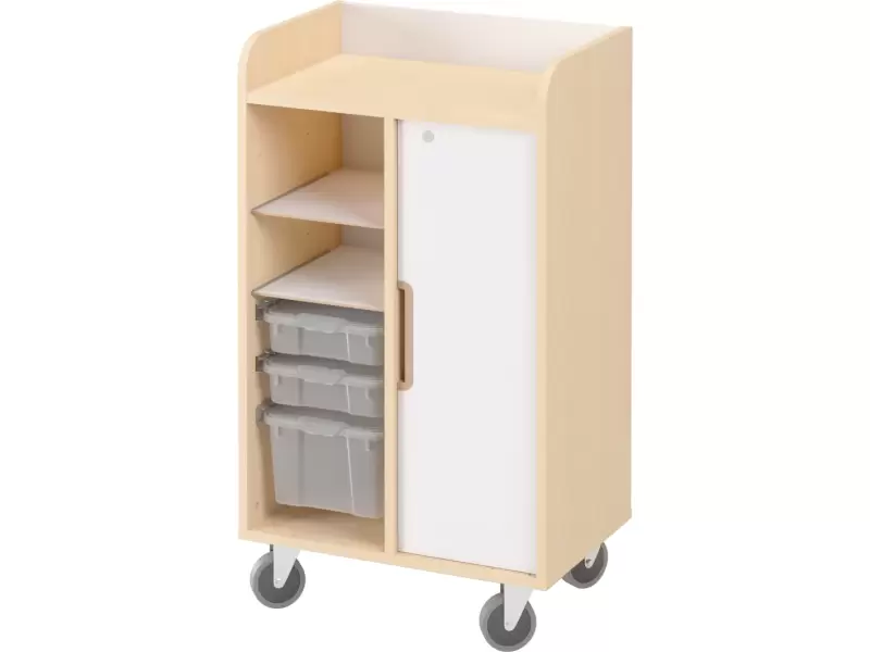 Mobiilne kapp töötasapinnaga on praktiline lahendus hariduslikele või loomingulistele ruumidele. Varustatud tugevate ratastega hõlpsaks teisaldamiseks, see tagab nii funktsionaalsuse kui ka mugavuse. Kapil on peal avar töötasapind, mis teeb sellest ideaalse pinna kirjutamiseks või töötamiseks. Kapil on avarad avatud riiulid ja suletud sektsioon kolme sisemise riiuliga. Lisaks on see varustatud praktiliste sahtlitega tarvikute hoidmiseks. Kapp on valmistatud 18 mm lamineeritud puitlaastplaadist kasevärvis. Riiulid on valmistatud 5 mm HDF-plaadist valges värvitoonis, mis pakub stabiilset pinda erinevate esemete hoidmiseks.